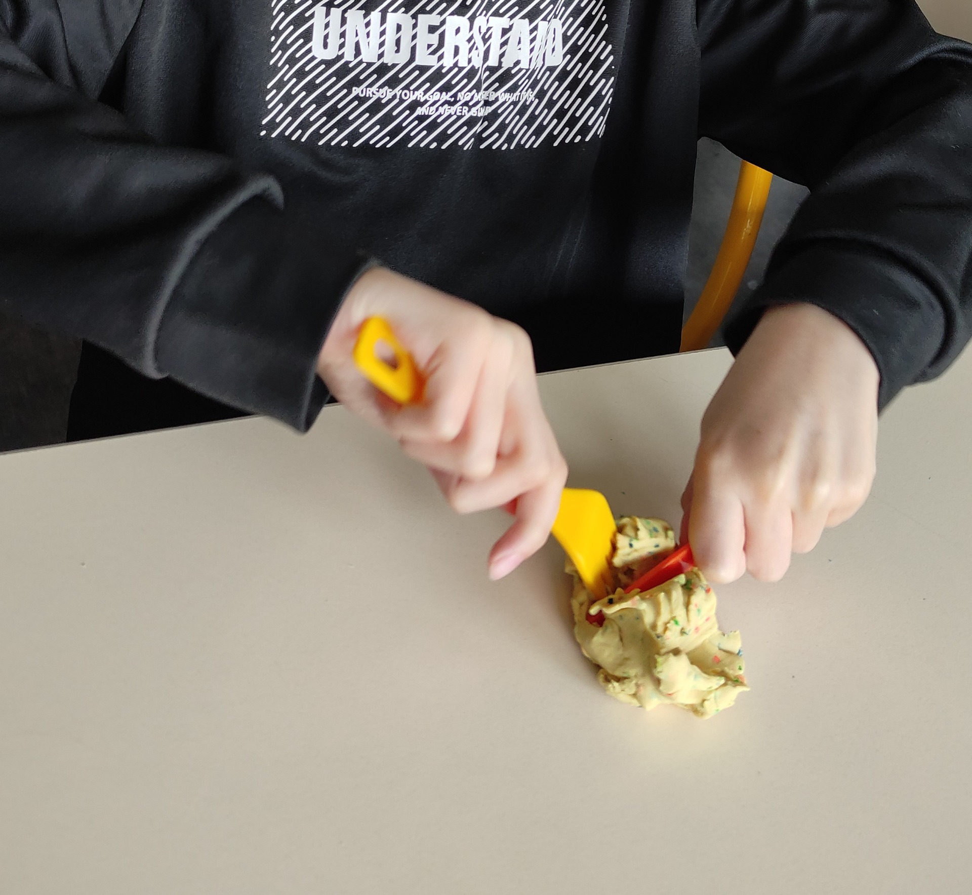 On apprend à utiliser son couteau et à coordonner ses gestes tout d'abord avec des textures simples comme la pâte à modeler.